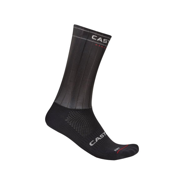 Die Castelli Fast Feet 4 Sock ist Teil des Fast Feet Projekts von Castelli und wurde konsequent auf maximale Aerodynamik ausgelegt. Im Gegensatz zu vielen herkömmlichen Aero-Socken basiert ihre Entwicklung nicht auf statischen Tests, sondern auf realitätsnahen Prüfverfahren, die die Bewegung des Unterschenkels simulieren und durch Tests mit Radsportlern validiert wurden. Das Ergebnis kann bei 50 km/h eine Ersparnis von bis zu 2 Watt bringen. Der Fußbereich orientiert sich an der bewährten Castelli Rosso Corsa Sock und sorgt für hohen Komfort im Schuh. Der Schaft besteht aus speziell entwickeltem, gerilltem Lycra®, das den Luftstrom gezielt ableitet und so die Aerodynamik unterstützt. Ein Anti-Rutsch-Einsatz aus Polyurethan am oberen Rand hält die Socke sicher in Position. Die neueste Version verfügt zudem über eine aktualisierte Bündchenpassform für noch mehr Komfort und Effizienz.