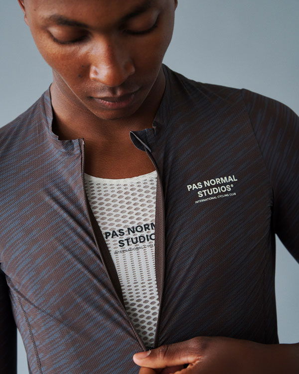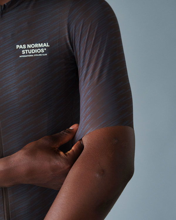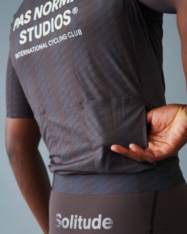 Das Solitude Radtrikot, eine Weiterentwicklung des SS23 Solitude Trikots, bietet verbesserte Taschenzugänglichkeit und tiefere Ärmelausschnitte für gesteigerten Komfort beim Radfahren. Die flexiblen Ärmel passen sich nahtlos jeder Form an und tragen zur Aerodynamik bei. Durch den Verzicht auf elastische Griffe und die offenen Kanten an reibungsintensiven Stellen wurde unnötige Spannung an den Ärmeln vermieden. Exklusiv für Pas Normal Studios entworfene, urheberrechtlich geschützte Materialien machen das Solitude Trikot aus. Sein Hauptstoff weist eine Mikrostruktur auf, die nicht nur atmungsaktiv ist, sondern auch das Ankleben am Körper reduziert, wodurch eine Basisschicht überflüssig wird.